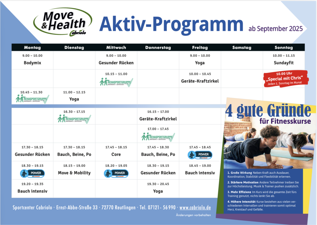 Von den Klassikern Bauch, Beine & Po, Bodypump und Rückenfit, über Rehasport bis hin zu Yoga.