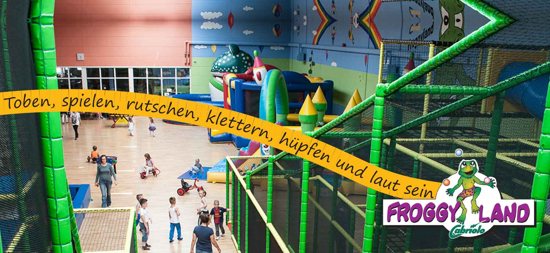 Egal wie das Wetter draußen ist, im Cabriolo Froggyland ist immer Spiel und Spaß angesagt: Toben, rennen, klettern, krabbeln, rutschen, springen, hüpfen – rauf, runter, drüber, drunter und was sonst noch alles geht! Spaß und Abenteuer an jeder Ecke! Alles was dir und deinen Freunden Spaß macht, haben wir für euch aufgebaut.